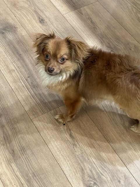 Symbol is a gorgeous little 7# red Pomeranian/ Chihuahua mix or Pomchi. He is two years old. His senior owner was breeding Pom mixes in New York. Her dementia was advanced, so the family got assistance from a local rescue for the many dogs and puppies on site. Symbol was the one dog she kept and packed him everywhere, but issues arose and the family had to rehome him. He is good with young children and adults but it will take possibly daysor weeks for him to trust you. Once he decides you are Ok he will be very close to you but with each new person in his life he will have to work through his very shy nature. He likes to be held but he is a busy little firecracker at times. If you know the Pommie breed you know what I mean. He is excellent in his small area at night. He is quiet and has made no potty accidents there. He is excellent with all his small 4-legged friends but at times the play gets a bit rough, so the adults call time out. He was previously in an apartment so is pretty good with halter and leash but could learn more. He has the most fun when he is outside and free to run and play.